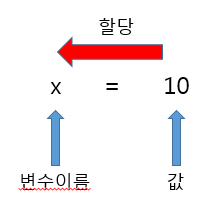 x=10 으로 입력하면 x라는 변수안에 값 10이 저장 되어있는 형태, a=50 으로 입력하면 a라는 변수안에 값 50이 저장 되어있는 형태 입니다.
