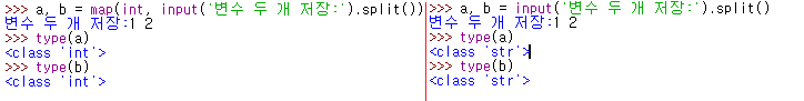 map 함수를 사용하여 정수형으로 선언해준 뒤 변수의 type을 보면 int형으로 출력되고, map 함수를 사용하지 않았을땐 str으로 출력됩니다.