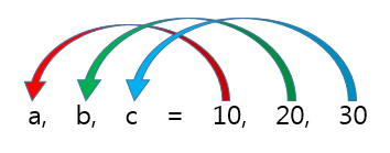a, b, c = 10, 20, 30 이런식으로 입력하면 a = 10, b = 20, c = 30 으로 할당 되는데, 변수와 값의 개수를 동일하게 맞춰주는것만 주의하여 주시면 됩니다.
