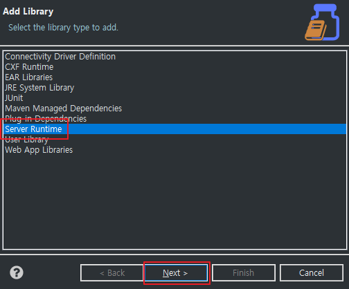 3. Server Runtime → Next → Apache Tomcat v8.5 (설치했던 톰캣 버전에 따라 다를 수 있습니다) → Finish