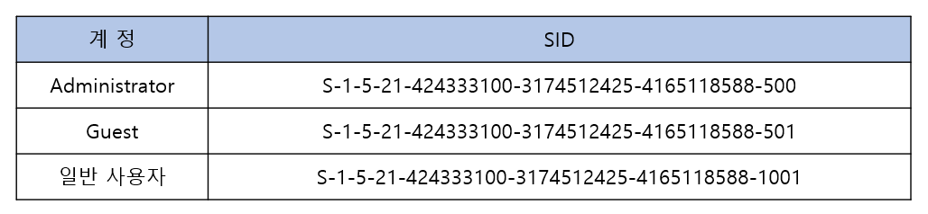 - SAM 파일(C:\Windows\System32\config\SAM)에 SID 정보가 저장