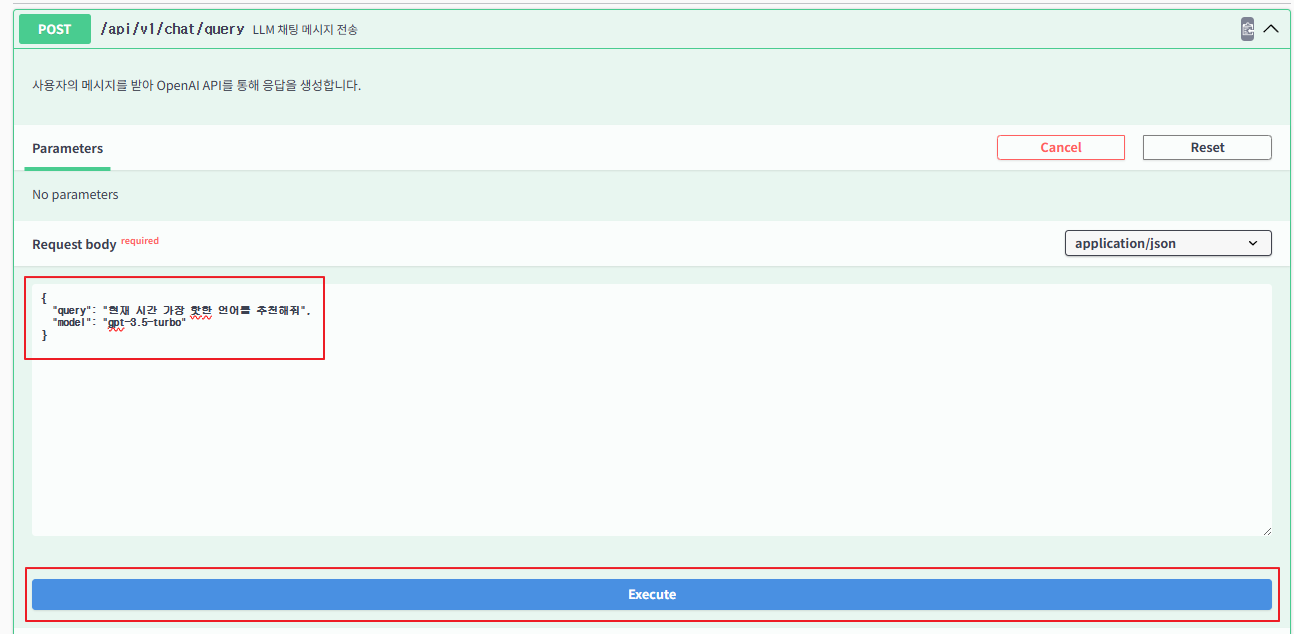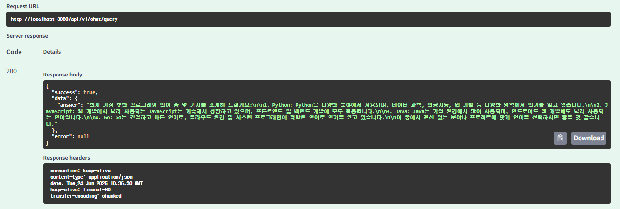 query는 질문이라고 생각하시면 되며, 모델은 gpt 등 ai 모델이라고 보시면 됩니다. 크레딧 없이 무료로 사용하시는 분들은 mini 모델(gpt-4o-mini 등)을 작성하시면 됩니다. 저는 "현재 시간 가장 핫한 언어를 추천해줘" 라고 질문하였으며 gpt-3.5-turbo 모델을 사용하였습니다.