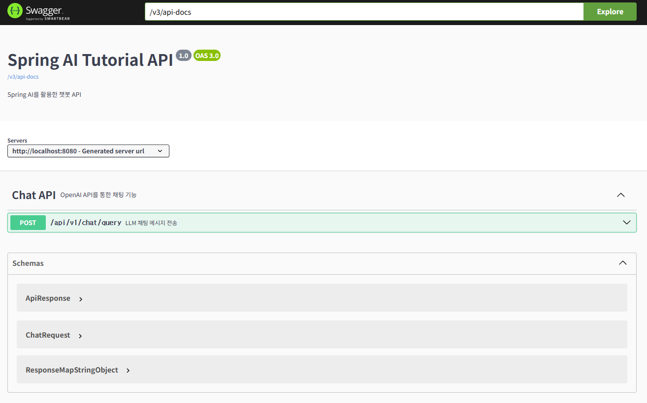 서버를 실행하신 후 스웨거 페이지로 이동하여 LLM을 호출 해보시면 됩니다. 저의 경우 기본 포트 8080을 사용중이기에 http://localhost:8080/swagger-ui/index.html 를 입력하면 아래와 같이 스웨거 문서를 확인하실 수 있습니다.
