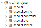 저의 경우 패키지 구조는 아래와 같이 진행합니다. 크게 config, controller, dto, service 4개의 패키지로 진행합니다.