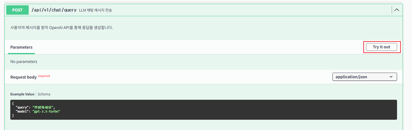 POST를 펼친 후 Try it out을 눌러 요청을 준비합니다.