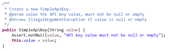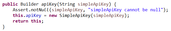 만약 전달받은 매개변수(simpleApiKey)가 null일 경우 Assert.notNull() 메서드에 의해 IlleagalArgumentException을 발생 시킵니다.