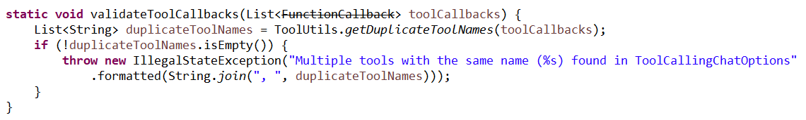 내부적으로 이러한 로직을 가지고 있습니다. toolCallBacks는 List 형태이므로 중복되는 병합하는 과정에서 의도치 않은 toolName이 중복되는 것을 고려하여 중복되는 것이 있는지 검사하는 메서드 입니다.