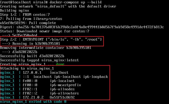 위와 같이 설정 후 docker-compose up 명령어를 입력하면 자동으로 Dockerfile을 빌드하여 베이스 이미지를 만들고 centos를 기반으로 한 nginx 이미지를 생성해줍니다.