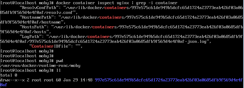 네임 스페이스만 간단히 살펴 보자면, 우선 아무런 컨테이너를 하나 실행시킨 후 /var/run/docker/runtime-runc/moby 로 이동하시면 아래와 같이 dockercontainer id로 만들어진 디렉토리가 보이실 겁니다.
