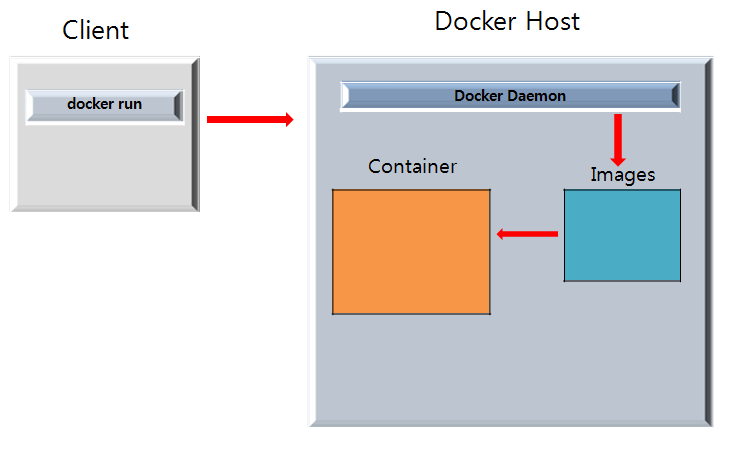 대표적인 build, pull, run의 명령어 실행 시 발생되는 아키텍처는 아래 사진과 같습니다.