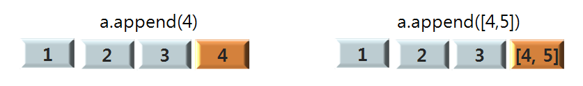 append는 리스트의 끝에 요소를 하나 추가 합니다. 아래 사진은 리스트 a = [1, 2, 3] 에 append로 요소 4를 추가한 모습(좌측)과 동일한 리스트 a에 append로 요소 [4, 5]를 추가한 모습(우측) 입니다.